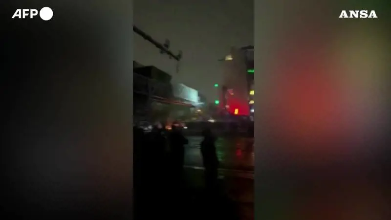 Le immagini UGC pubblicate sui social media mostrano un edificio governativo in fiamme a Karaj, in Iran, la sera del 9 gennaio 2026. Le principali citta' iraniane sono state colpite durante la notte da nuove manifestazioni di massa che denunciavano la Repubblica islamica, mentre sabato gli attivisti hanno espresso il timore che le autorita' stessero intensificando la repressione delle manifestazioni, approfittando di un blackout di Internet. Una folla di persone cammina sull'autostrada Vakil Abad a Mashhad mentre canta in persiano "Questa e' l'ultima battaglia, Pahlavi sta tornando". Altri manifestanti, nel mentre, camminano su Pasdaran Avenue a Teheran intonando le parole: "Oh, Scia' dei fedeli, torna in Iran, quelli che indossano il turbante hanno fottuto l'Iran".
