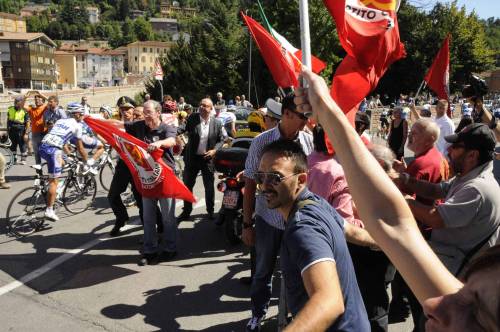 I manifestanti si sono sdraiati sulla strada dove doveva passare la prima tappa della corsa, a Mondovì. Solo l'intervento delle forze dell'ordine ha permesso la ripresa della manifestazione sportiva. Ferito un poliziotto